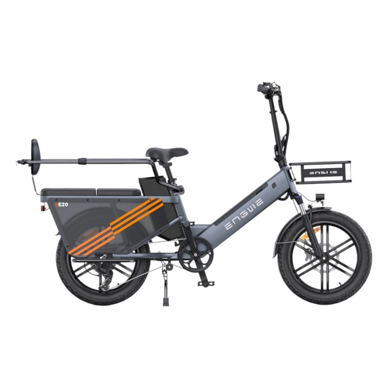 ENGWE LE20 “Passenger” — Bicicleta cargo familiar longtail: cuadro bajo, sensor de par, motor 250 W / 75 Nm, neumáticos 20×3.0 y frenos hidráulicos de 180 mm. Diseñada para transportar hasta 2 niños en la parte trasera.
