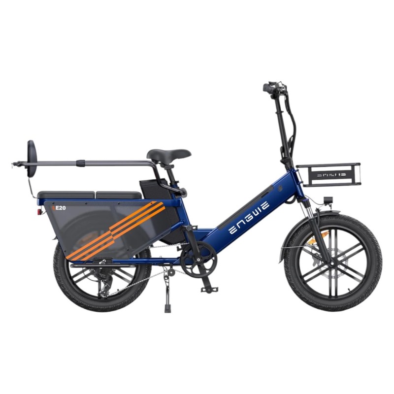 ENGWE LE20 “Passenger” — Bicicleta cargo familiar longtail: cuadro bajo, sensor de par, motor 250 W / 75 Nm, neumáticos 20×3.0 y frenos hidráulicos de 180 mm. Diseñada para transportar hasta 2 niños en la parte trasera.