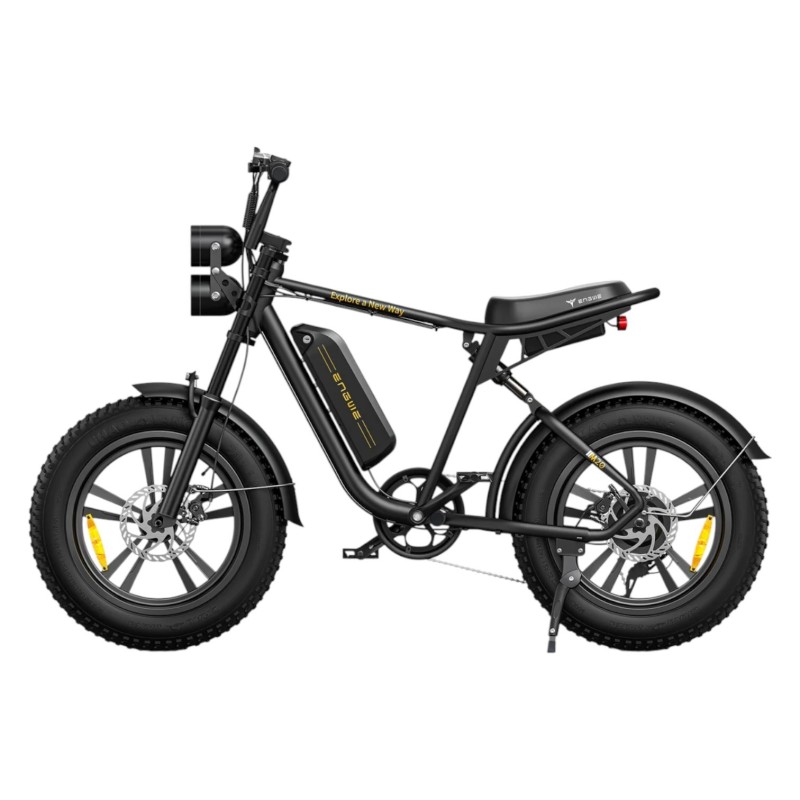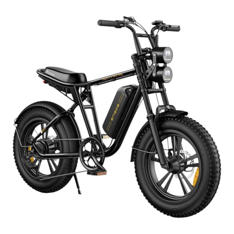 ENGWE M20 – Fat bike électrique style moto : look rétro-moto, double phare LED, double suspension (fourche + amortisseur arrière) pour le confort en ville comme sur chemins.
