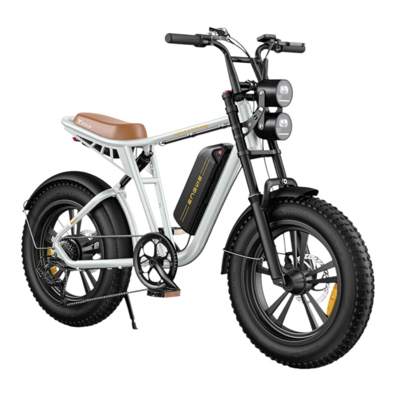 ENGWE M20 – Fat bike elettrica stile moto: look retrò-moto, doppio faro LED, doppia sospensione (forcella + ammortizzatore posteriore) per il comfort in città e su percorsi sterrati.